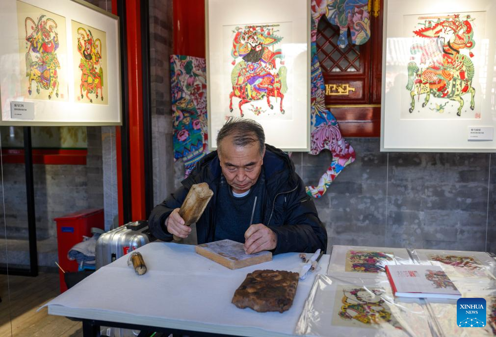 Tai Liping, a representative inheritor of Fengxiang Woodblock New Year paintings, a national intangible cultural heritage project, engraves woodblock prints at Prince Kung's Palace Museum in Beijing, capital of China, Feb. 4, 2026. An exhibition displaying more than a hundred exquisite Chinese New Year paintings collected by Prince Kung's Palace Museum opened here on Wednesday. (Xinhua/Jin Liangkuai)