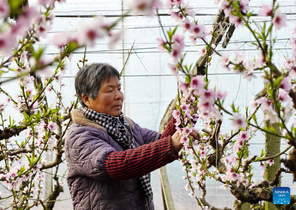 A farmer tends peach flowers in a greenhouse in Tangshan Port economic development zone in Tangshan, north China's Hebei Province, Feb. 4, 2026.