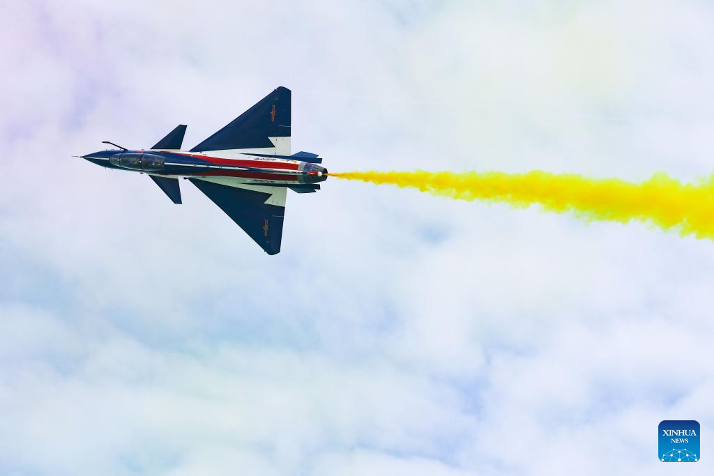 An aircraft of the Bayi Aerobatic Team of the Chinese People's Liberation Army (PLA) Air Force performs during the 10th Singapore Airshow in Singapore, Feb. 4, 2026. The 10th Singapore Airshow opened on Tuesday at the Changi Exhibition Center. The airshow runs until Feb. 8, with the Bayi Aerobatic Team of the Chinese People's Liberation Army (PLA) Air Force delivering flight displays. (Photo by Zhu Jianghai/Xinhua)