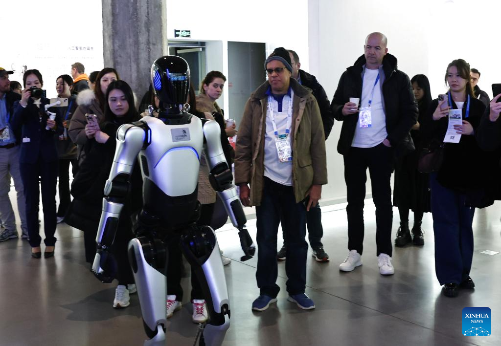 Guests watch a humanoid robot at an artificial intelligence temporary exhibition area at the WorldSkills Museum in Shanghai, east China, Feb. 4, 2026. As one of the 48th WorldSkills Competition Preparation Week activities, the Shanghai promotion campaign and intangible cultural heritage experience event was held here on Wednesday, which was attended by over 700 guests from home and abroad. (Xinhua/Fang Zhe)