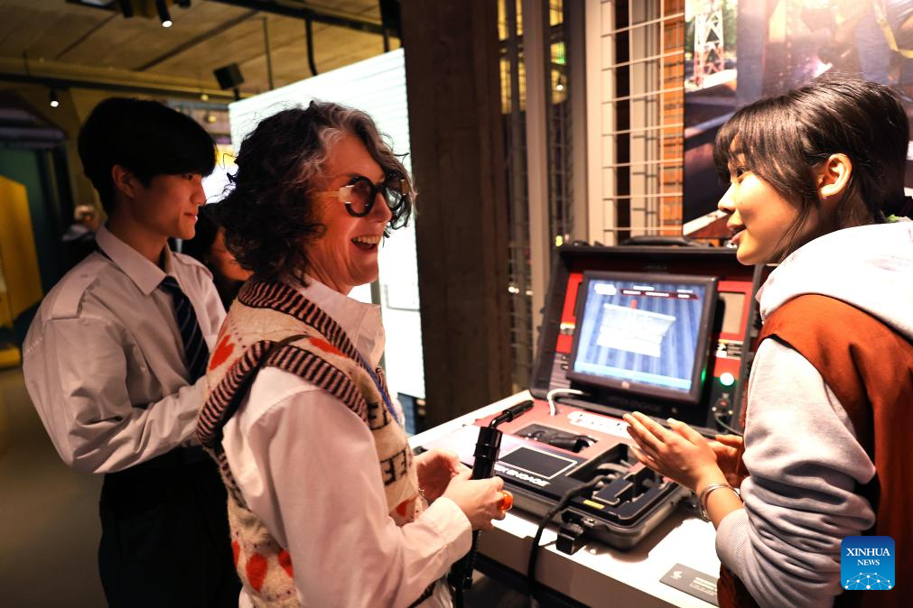 A guest (C) experiences interactive games at the WorldSkills Museum in Shanghai, east China, Feb. 4, 2026. As one of the 48th WorldSkills Competition Preparation Week activities, the Shanghai promotion campaign and intangible cultural heritage experience event was held here on Wednesday, which was attended by over 700 guests from home and abroad. (Xinhua/Fang Zhe)
