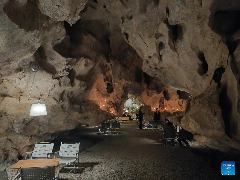This photo taken on Nov. 23, 2025 shows an interior view of Xiu Café, a coffeehouse built inside a natural karst cave in Xiuwen County, southwest China's Guizhou Province. (Xinhua/Wu Si)