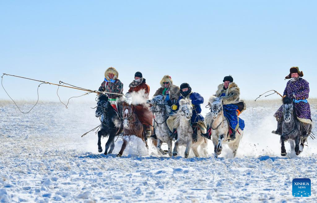 Herdsmen ride on horses on a snowfield during a new year event in Xilinhot City, Xilingol League, north China's Inner Mongolia Autonomous Region, Feb. 5, 2026. (Photo by Wang Zheng/Xinhua)