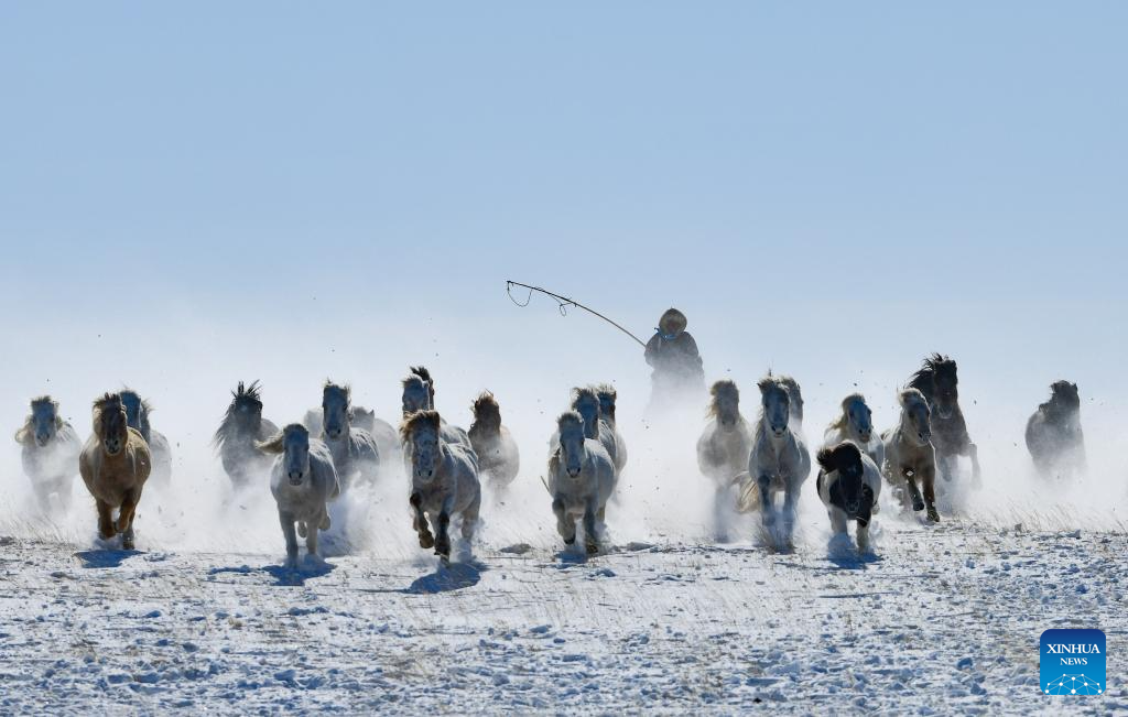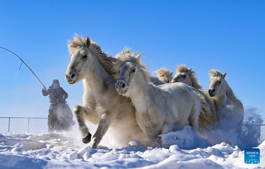 A herdsman drives horses on a snowfield during a new year event in Xilinhot City, Xilingol League, north China's Inner Mongolia Autonomous Region, Feb. 5, 2026. (Photo by Wang Zheng/Xinhua)