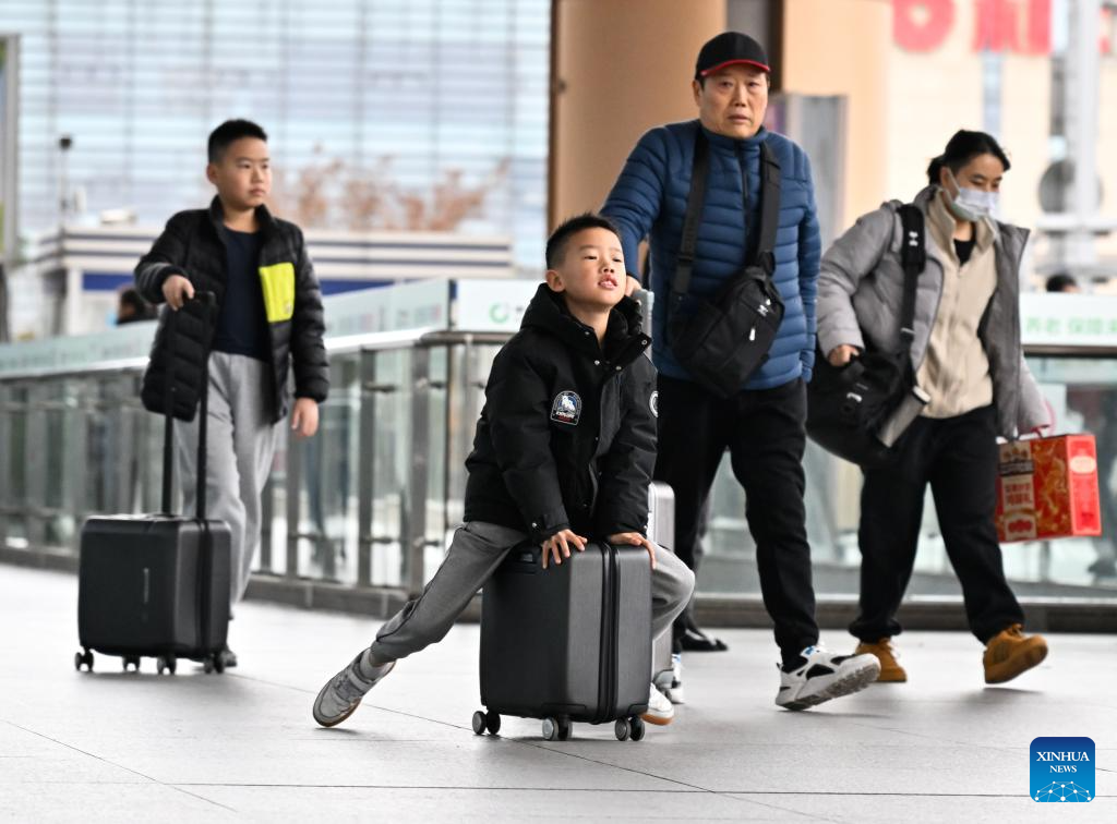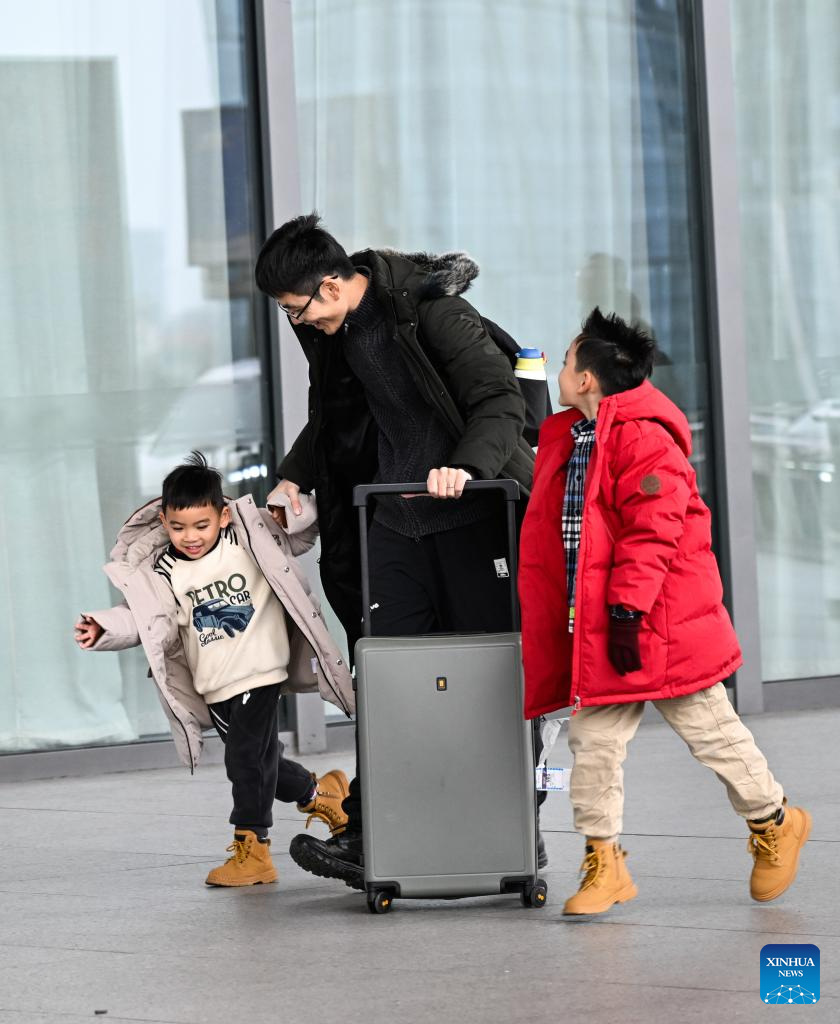 Children travelling with their family are about to take a train at the Nanjing South Railway Station in Nanjing, east China's Jiangsu Province, Feb. 6, 2026. (Xinhua/Ji Chunpeng)