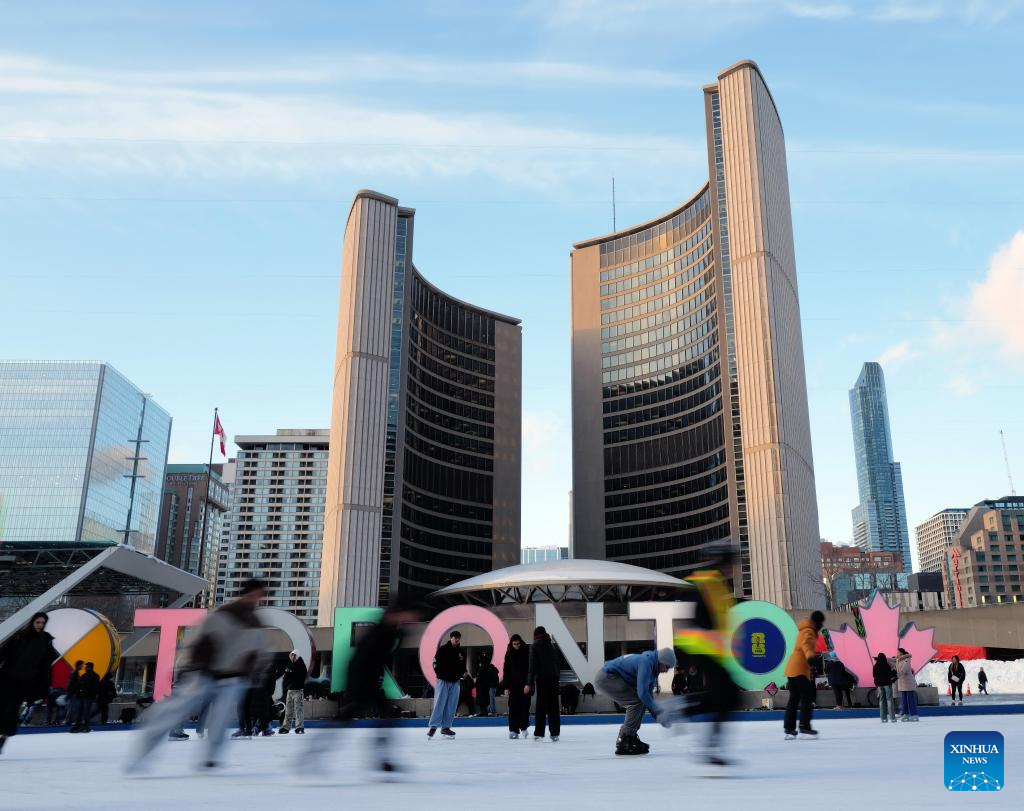 People skate on an outdoor ice rink outside the City Hall in Toronto, Ontario, Canada, Feb. 4, 2026. (Photo by Yang Shu/Xinhua)