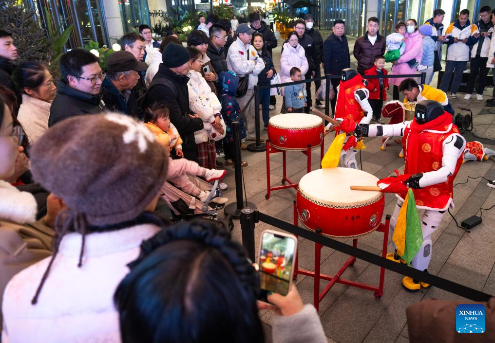 People watch humanoid robot performance at an event themed on the "Hubei New Spring International Consumption Season" in Wuhan, central China's Hubei Province, Feb. 5, 2026. (Xinhua/Xiao Yijiu)