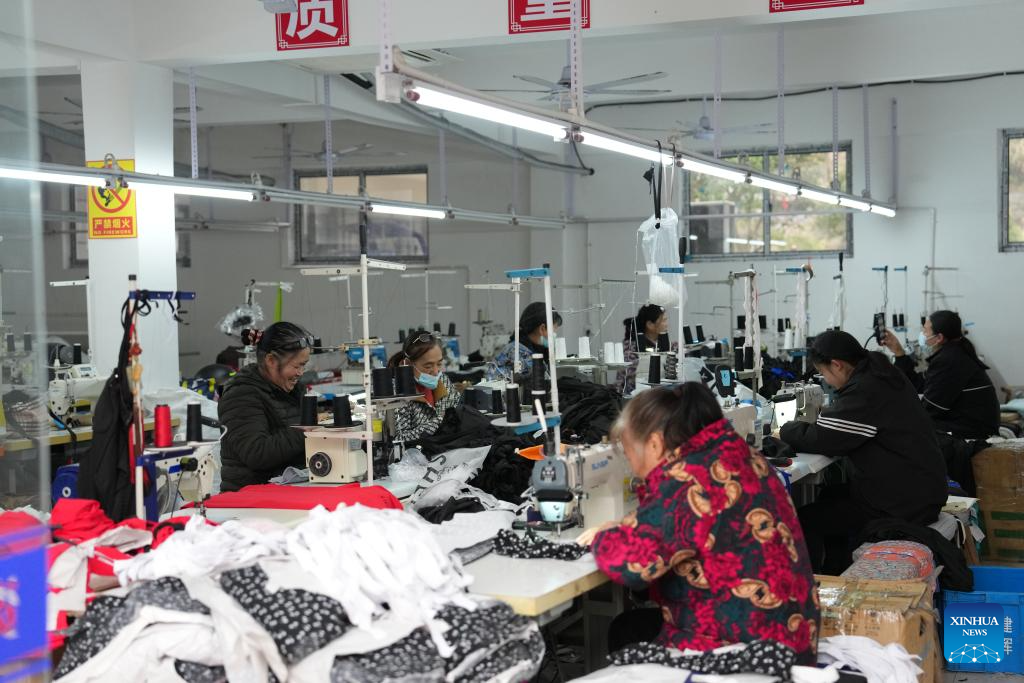 Local residents work at a garment factory at a resettlement site in Zhoumensi Town, Zixing City, central China's Hunan Province, Feb. 5, 2026. In July 2024, rainstorms unleashed by Typhoon Gaemi hit Zixing City, affecting about 128,000 people and damaging 23,000 houses.