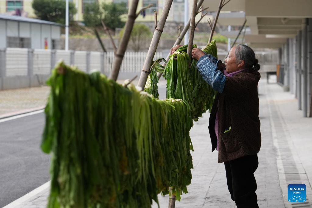 A senior resident air-dries vegetables at a resettlement site in Zhoumensi Town, Zixing City, central China's Hunan Province, Feb. 5, 2026. In July 2024, rainstorms unleashed by Typhoon Gaemi hit Zixing City, affecting about 128,000 people and damaging 23,000 houses.