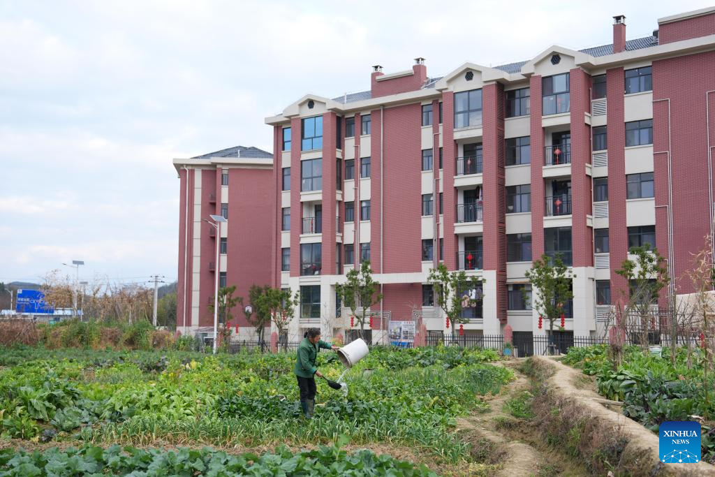 A local resident applies fertilizer to vegetables at a resettlement site in Xingning Town, Zixing City, central China's Hunan Province, Feb. 4, 2026. In July 2024, rainstorms unleashed by Typhoon Gaemi hit Zixing City, affecting about 128,000 people and damaging 23,000 houses.