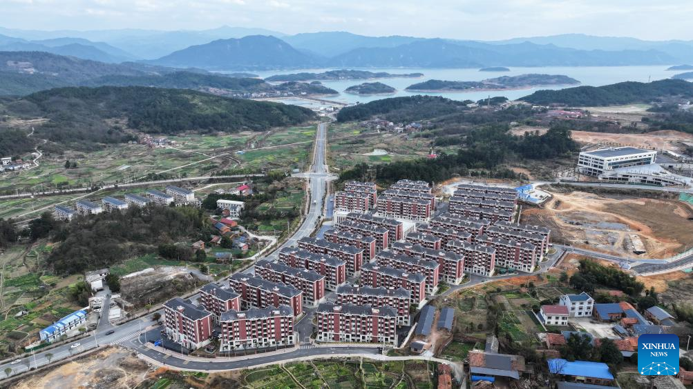 An aerial drone photo taken on Feb. 4, 2026 shows a resettlement site in Xingning Town, Zixing City, central China's Hunan Province. In July 2024, rainstorms unleashed by Typhoon Gaemi hit Zixing City, affecting about 128,000 people and damaging 23,000 houses.