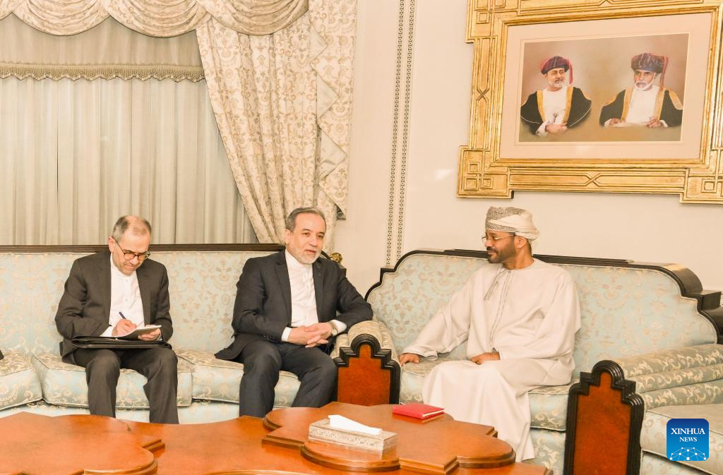 Omani Foreign Minister Sayyid Badr bin Hamad bin Hamood Albusaidi (R) meets with Iranian Foreign Minister Seyed Abbas Araghchi (C) in Muscat, Oman, Feb. 6, 2026. Oman's Foreign Ministry said on Friday that the ongoing indirect talks between Iranian and U.S. delegations in Muscat are focused on preparing the ground for the resumption of diplomatic and technical negotiations on the Iranian nuclear issues. (Xinhua)