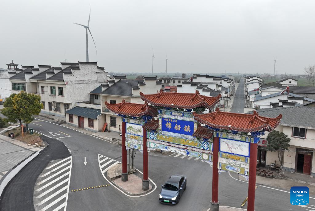 A drone photo shows a new energy vehicle on a road on Mianchuan Island of Jiujiang City, east China's Jiangxi Province, Jan. 29, 2026. Mianchuan Island, located in the Jiangxi section of the Yangtze River and surrounded by water, covers an area of 104 square kilometers. It can be reached by a ten-minute ferry ride from Madang Ferry Terminal in Jiujiang City. (Xinhua/Wan Xiang)