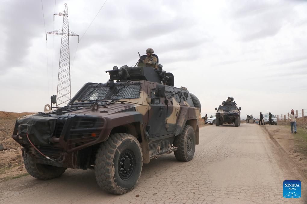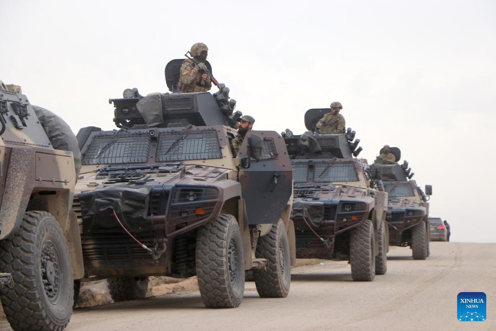 Photo taken on Feb. 6, 2026 shows Syrian army vehicles in Hasakah, Syria. A delegation of Syria's defense authorities arrived in the northeastern city of Hasakah on Friday to coordinate procedures of integrating the Kurdish-led Syrian Democratic Forces (SDF) into the national military, advancing an internationally-backed ceasefire and phased integration deal signed on Jan. 30. (Str/Xinhua)