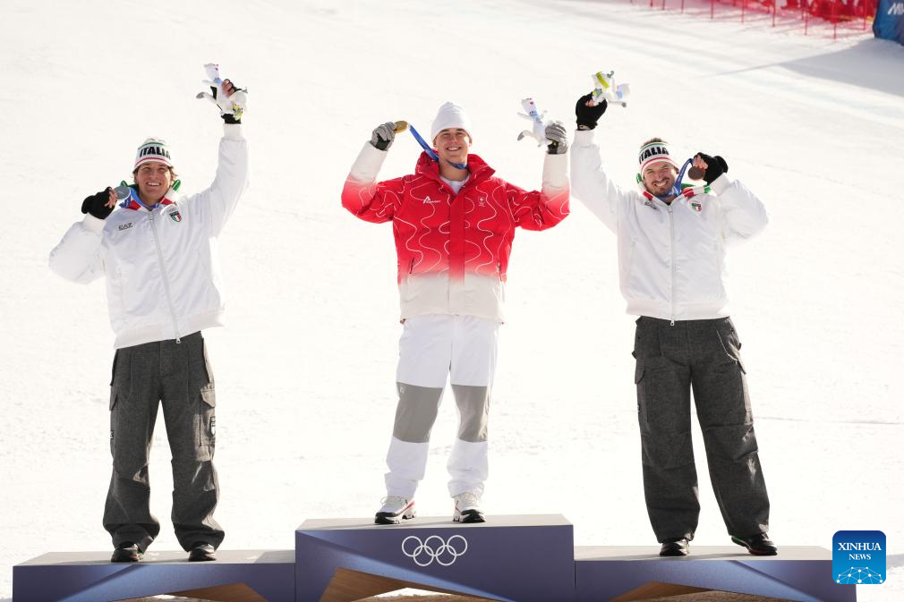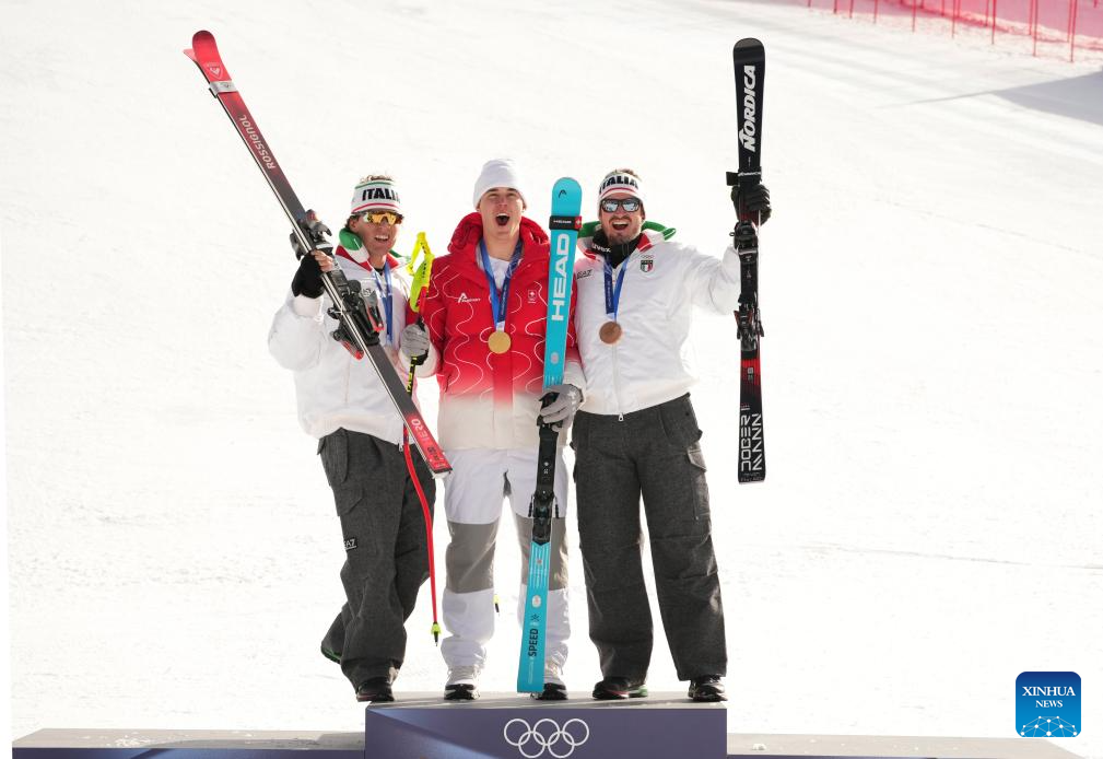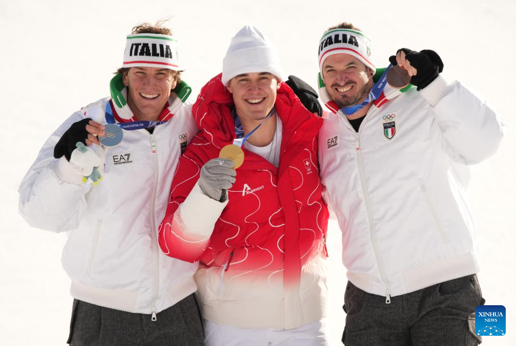 Gold medalist Franjo von Allmen (C) of Switzerland, silver medalist Giovanni Franzoni (L) of Italy and bronze medalist Dominik Paris of Italy pose for photos during the awarding ceremony for the alpine skiing men's downhill of the Milan-Cortina 2026 Olympic Winter Games in Bormio, Italy, Feb. 7, 2026. (Xinhua/Yan Linyun)
