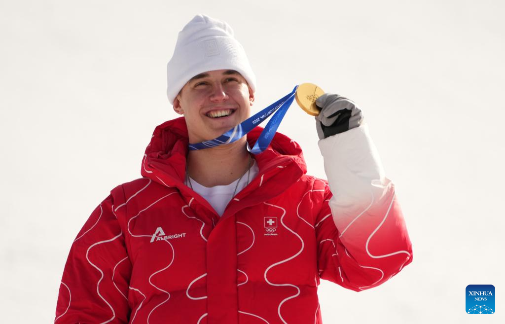 Gold medalist Franjo von Allmen of Switzerland poses for photos during the awarding ceremony for the alpine skiing men's downhill of the Milan-Cortina 2026 Olympic Winter Games in Bormio, Italy, Feb. 7, 2026. (Xinhua/Yan Linyun)