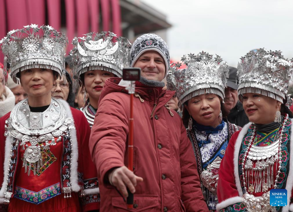 A man takes a selfie with performers in traditional costumes during the Budapest Chinatown Spring Festival Temple Fair in Budapest, Hungary, on Feb. 7, 2026. (Photo by Laszlo Balogh/Xinhua)