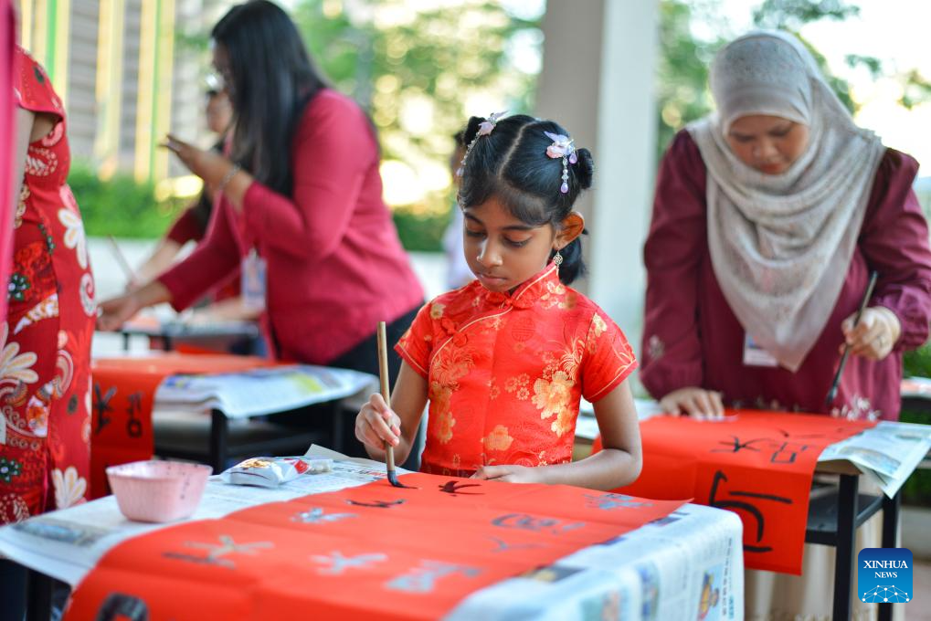 Teachers and students write Spring Festival couplets at a school in Kuala Lumpur, Malaysia, Feb. 7, 2026. A series of celebrations has been held to mark the upcoming Chinese New Year, or the Spring Festival. (Photo by Chong Voon Chung/Xinhua)