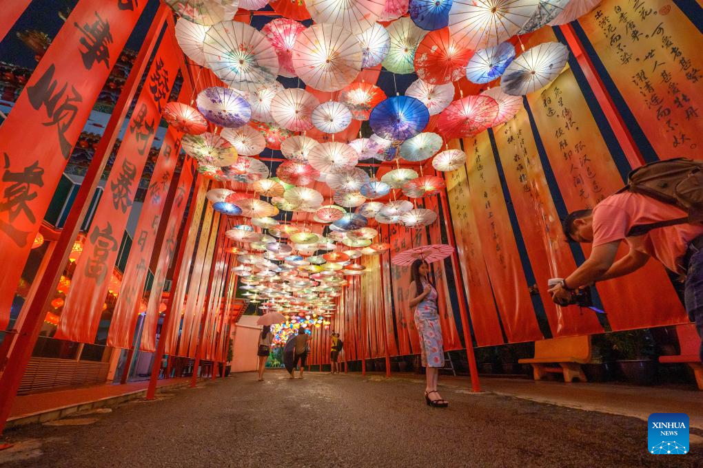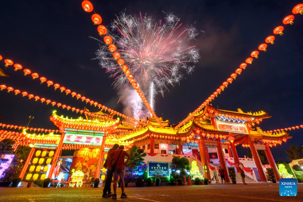 People take photos of festive decorations at the Thean Hou Temple in Kuala Lumpur, Malaysia, Feb. 7, 2026. A series of celebrations has been held to mark the upcoming Chinese New Year, or the Spring Festival. (Photo by Chong Voon Chung/Xinhua)