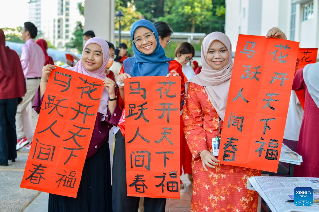 Teachers and students display Spring Festival couplets at a school in Kuala Lumpur, Malaysia, Feb. 7, 2026. A series of celebrations has been held to mark the upcoming Chinese New Year, or the Spring Festival. (Photo by Chong Voon Chung/Xinhua)