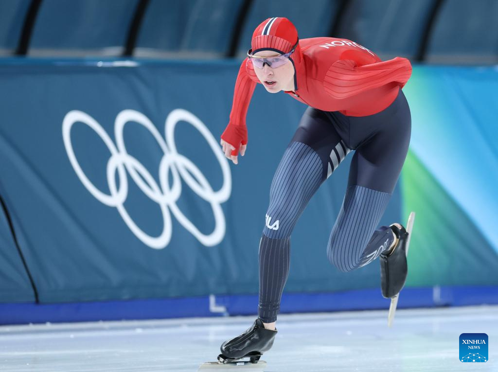 Ragne Wiklund of Norway competes during the speed skating women's 3000m final at the Milan-Cortina 2026 Olympic Winter Games in Milan, Italy, Feb. 7, 2026. (Xinhua/Du Xiaoyi)