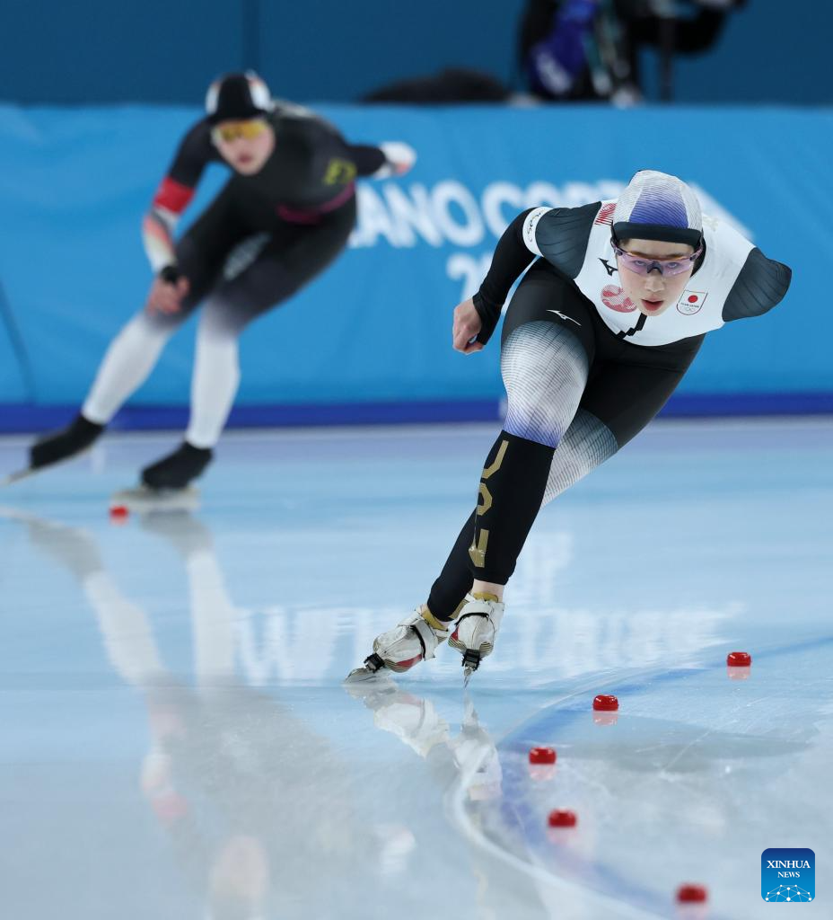 Horikawa Momoka (front) of Japan competes during the speed skating women's 3000m final at the Milan-Cortina 2026 Olympic Winter Games in Milan, Italy, Feb. 7, 2026. (Xinhua/Li Jing)