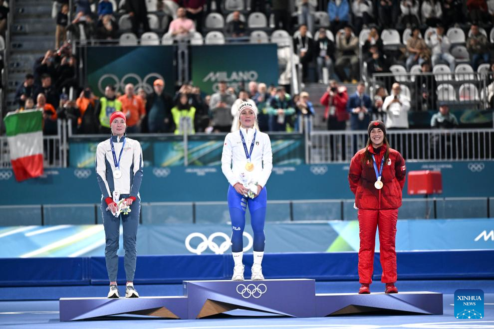 Gold medalist Francesca Lollobrigida (C) of Italy, silver medalist Ragne Wiklund (L) of Norway and bronze medalist Valerie Maltais of Canada attend the awarding ceremony of the speed skating women's 3000m at the Milan-Cortina 2026 Olympic Winter Games in Milan, Italy, Feb. 7, 2026. (Xinhua/Wu Wei)