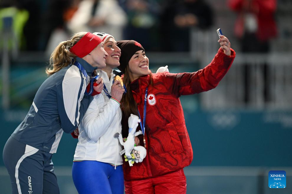 Gold medalist Francesca Lollobrigida (C) of Italy, silver medalist Ragne Wiklund (L) of Norway and bronze medalist Valerie Maltais of Canada take a selfie during the awarding ceremony of the speed skating women's 3000m at the Milan-Cortina 2026 Olympic Winter Games in Milan, Italy, Feb. 7, 2026. (Xinhua/Wu Wei)