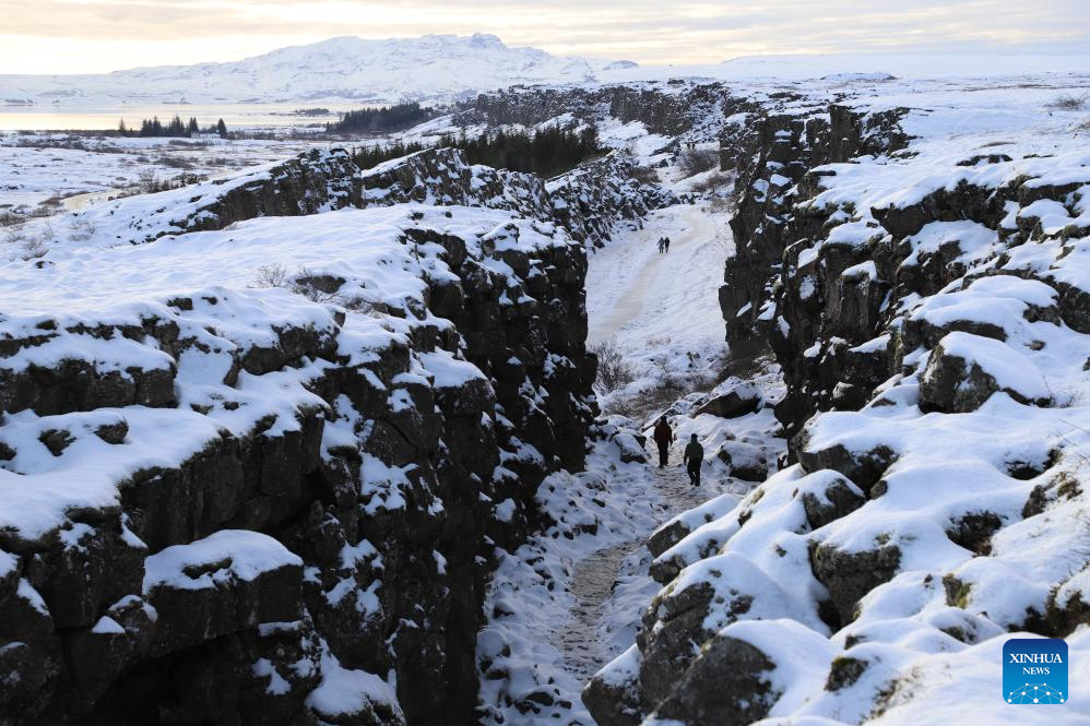 Tourists walk among rocky cliffs at Thingvellir National Park in Iceland on Feb. 7, 2026. (Xinhua/Zhu Haochen)