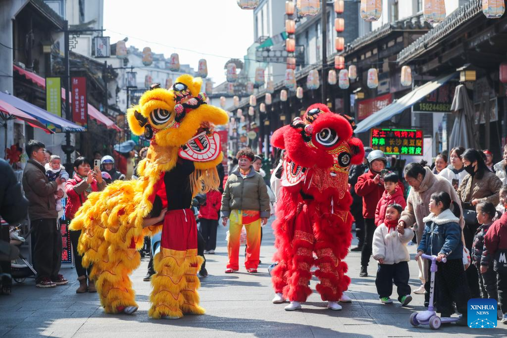 Lion dance performers interact with tourists at Shouchang ancient town in Jiande, east China's Zhejiang Province, Feb. 8, 2026. Shouchang ancient town has recently held traditional folk activities such as folk parades, dragon and lion dances, and a lantern show to welcome the Chinese New Year. (Xinhua/Xu Yu)