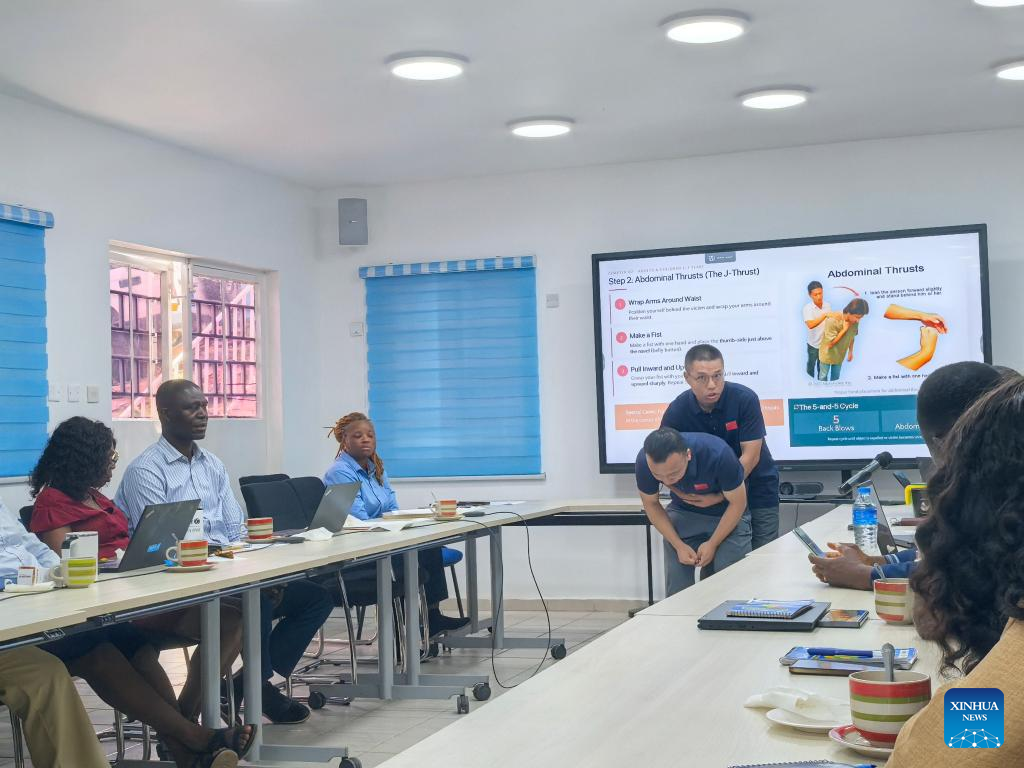 Members of the 26th batch of Chinese medical team demonstrate Heimlich maneuver to the United Nations Children's Fund (UNICEF) Sierra Leone staff in Freetown, Sierra Leone on Feb. 9, 2026. (The 26th batch of the Chinese medical team to Sierra Leone/Handout via Xinhua)