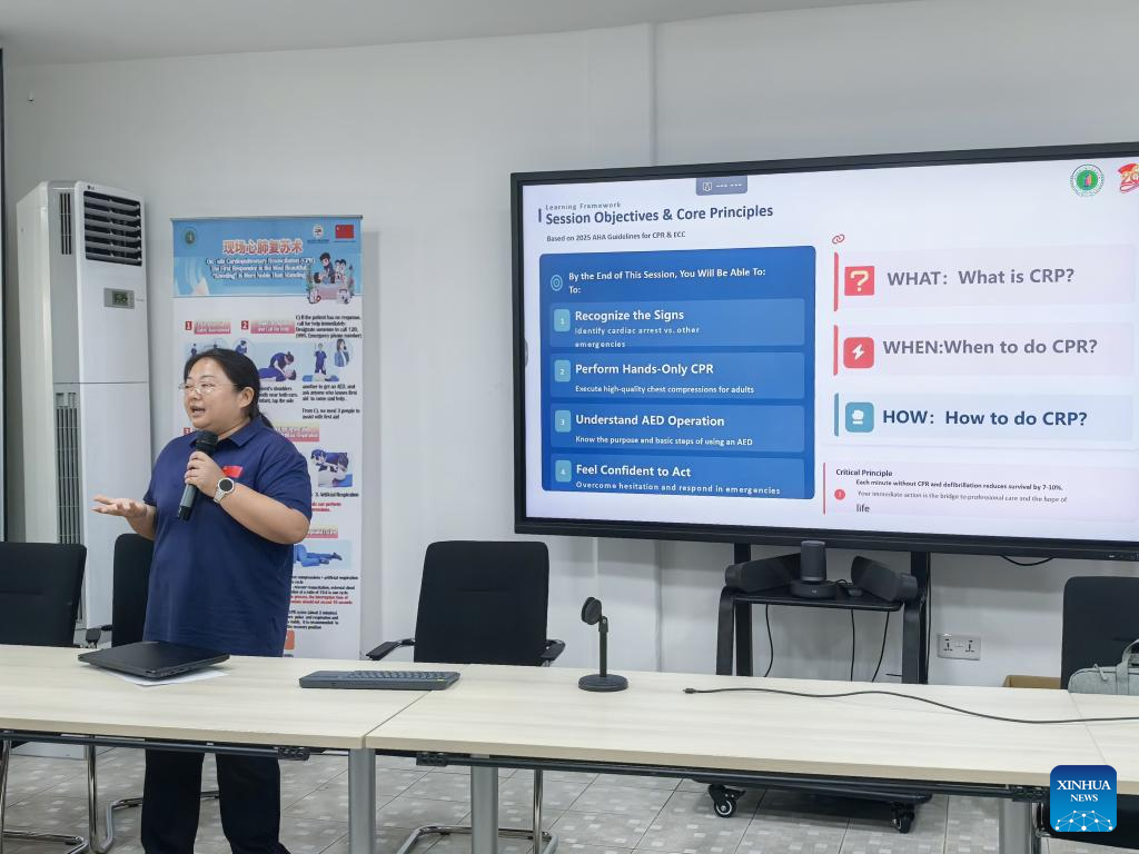 A member of the 26th batch of Chinese medical team gives a lecture on the theory of cardiopulmonary resuscitation to the United Nations Children's Fund (UNICEF) Sierra Leone staff in Freetown, Sierra Leone on Feb. 9, 2026. (The 26th batch of the Chinese medical team to Sierra Leone/Handout via Xinhua)
