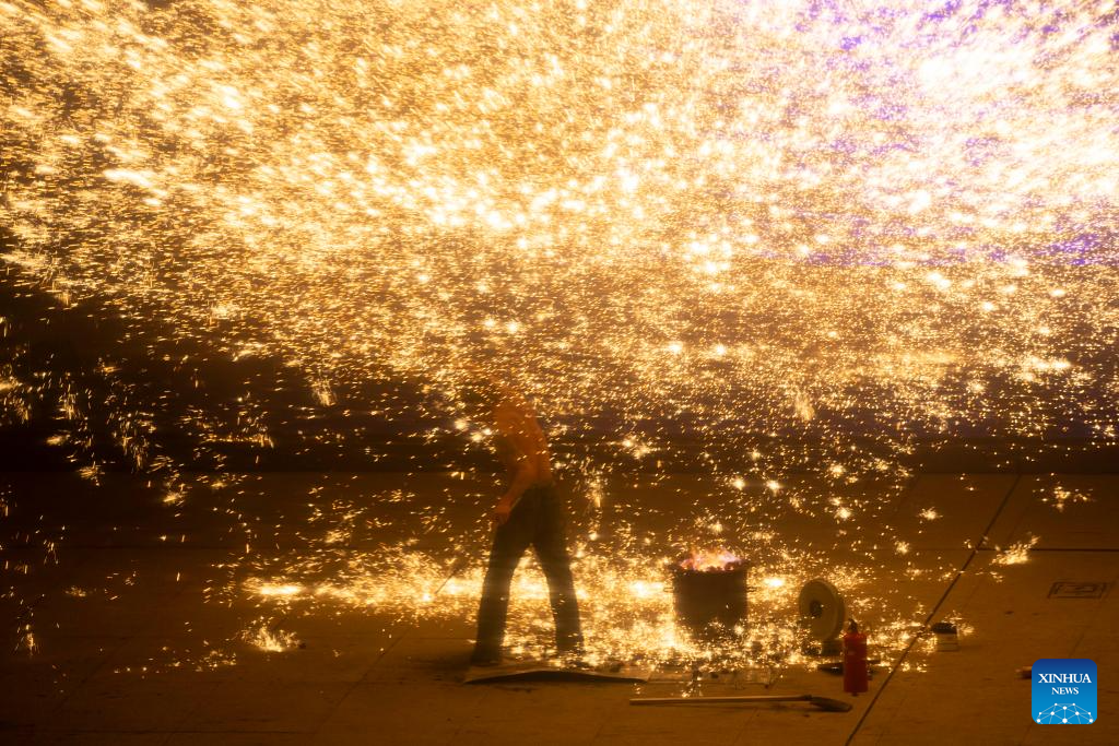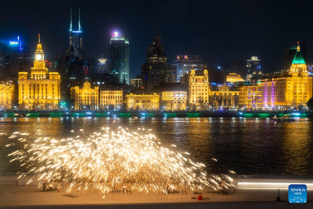 A molten iron fireworks show is staged by the Huangpu River in Pudong, east China's Shanghai, on Feb. 8, 2026. (Xinhua/Wang Xiang)