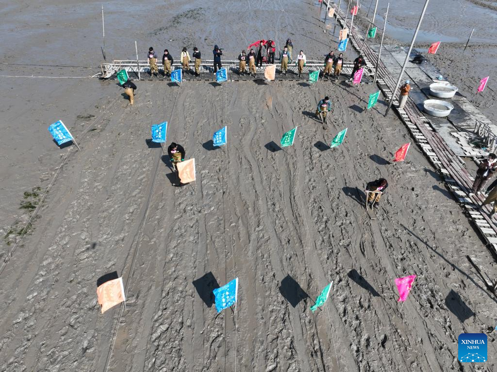 An aerial drone photo taken on Feb. 8, 2026 shows people attending a "munima" racing competition in Xiapu County, southeast China's Fujian Province. "Munima," meaning "wooden mud horse" in Chinese, is a traditional sled-like tool for gliding over tidal flats to pick up seafood. Horse-themed tourism has surged recently in Xiapu County as the lunar Year of the Horse approaches. (Xinhua/Jiang Kehong)