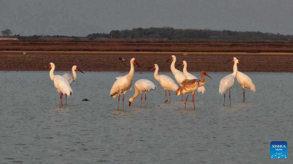 Siberian cranes are pictured at Poyang Lake wetland in east China's Jiangxi Province, Nov. 18, 2025. (Photo by Yu Qiwen/Xinhua)