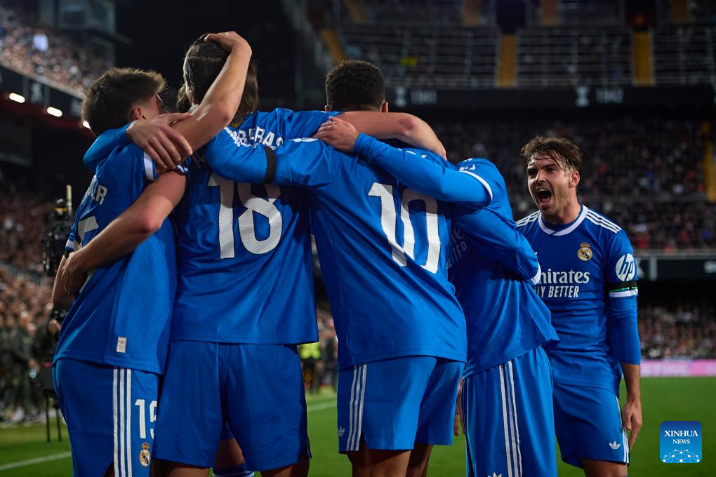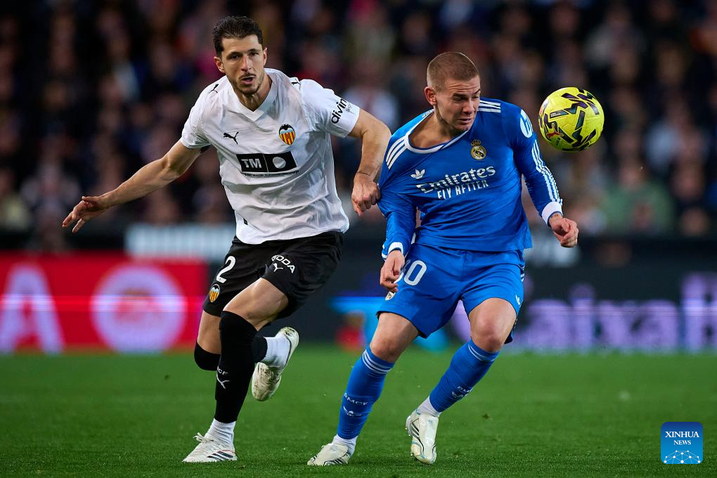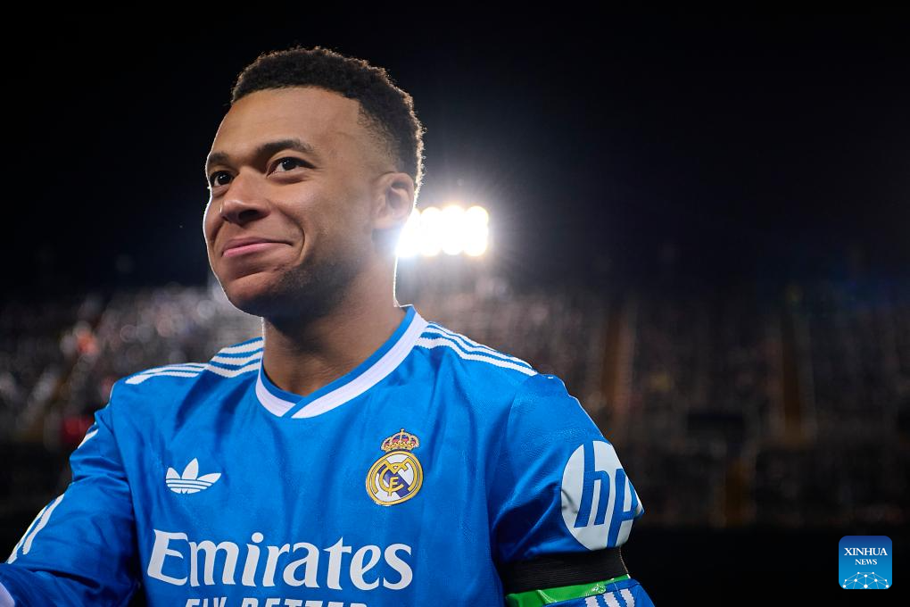 MADRID, Feb. 8 (Xinhua) -- Second-half goals from left back Alvaro Carreras and Kylian Mbappe gave Real Madrid a 2-0 win away to Valencia on Sunday night, keeping the defending champion one point behind FC Barcelona in the La Liga title race.