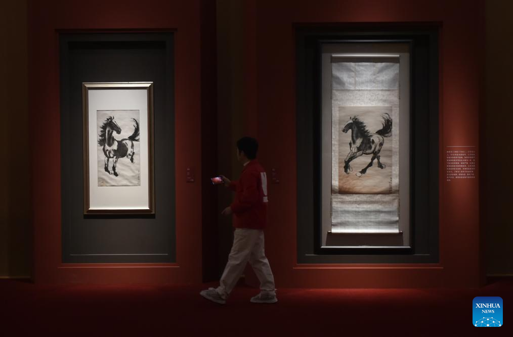 A visitor views paintings of Xu Beihong at the National Art Museum of China in Beijing, capital of China, Feb. 9, 2026. The opening ceremony of the Spring Festival Exhibition Series of National Art Museum of China (NAMOC) was held here on Monday. The series includes five exhibitions, covering various art forms such as Chinese painting, oil painting, printmaking, sculpture, etc. (Xinhua/Lu Peng)
