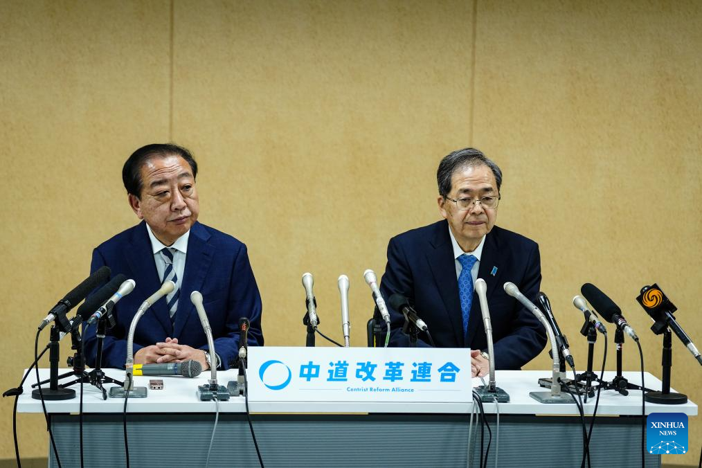 Yoshihiko Noda (L) and Tetsuo Saito, co-leaders of Japan's main opposition party Centrist Reform Alliance, attend a press conference in Tokyo, Japan, Feb. 9, 2026. Yoshihiko Noda and Tetsuo Saito, co-leaders of Japan's main opposition party Centrist Reform Alliance, announced on Monday that they would resign from their posts to take responsibility for the party's defeat in the House of Representatives election. (Xinhua/Jia Haocheng)