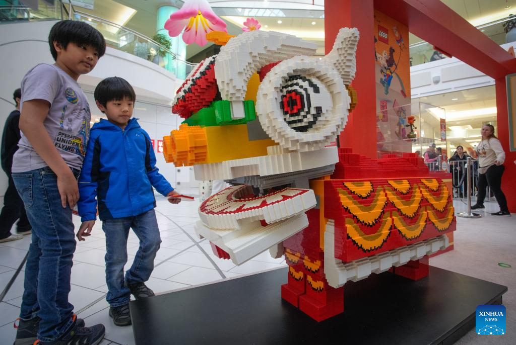 Children look at a large-scale LEGO lion model during a LEGO pop-up event to celebrate the upcoming Year of the Horse at Metrotown Shopping Mall in Burnaby, British Columbia, Canada, on Feb. 8, 2026. (Photo by Liang Sen/Xinhua)