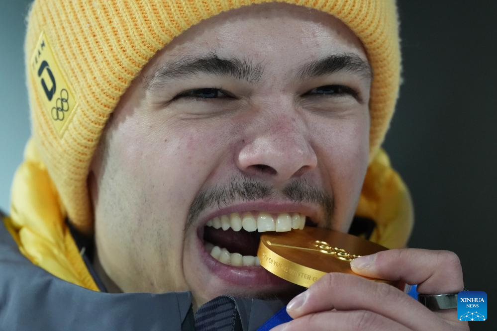 Gold medallist Philipp Raimund of Germany bites the medal during the awarding ceremony for the Ski Jumping Men's Normal Hill Individual of the 2026 Milan-Cortina Winter Olympics in Predazzo, Italy, Feb. 9, 2026. (Xinhua/Meng Yongmin)