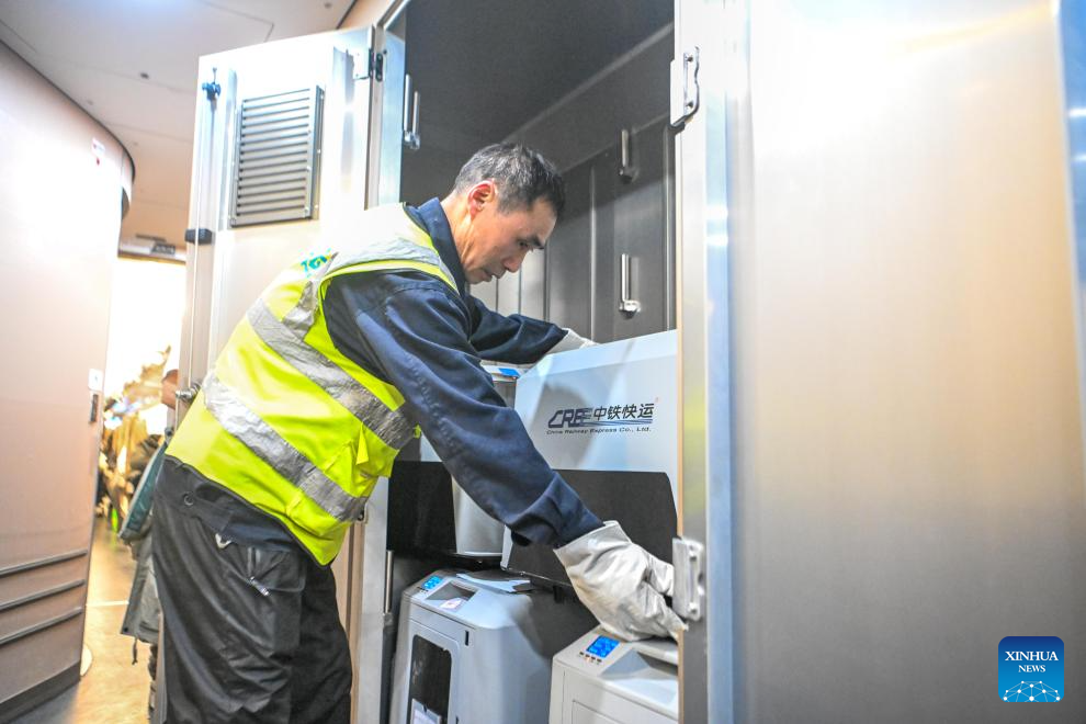A staff member places a pet transport case on a bullet train at Chongqing West Railway Station in southwest China's Chongqing Municipality, Feb. 9, 2026. Chongqing railway authorities have launched a pilot pet consignment service on high-speed railways on designated routes during the ongoing Spring Festival travel rush.