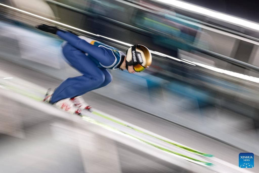 Kacper Tomasiak of Poland competes during the Ski Jumping Men's Normal Hill Individual of the 2026 Milan-Cortina Winter Olympics in Predazzo, Italy, Feb. 9, 2026. (Xinhua/Huang Wei)