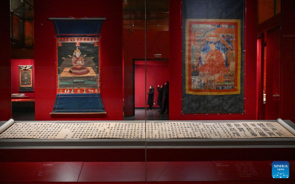 People visit the exhibition "Beyond Time: the history, culture and art of Sakya Monastery" at the Palace Museum in Beijing, capital of China, Feb. 9, 2026. The exhibition, which will last till May 10, showcases over 200 relics reflecting the history, culture and art of Sakya Monastery, the earliest monastery of the Sakya Sect of the Tibetan Buddhism. (Xinhua/Li Xin)