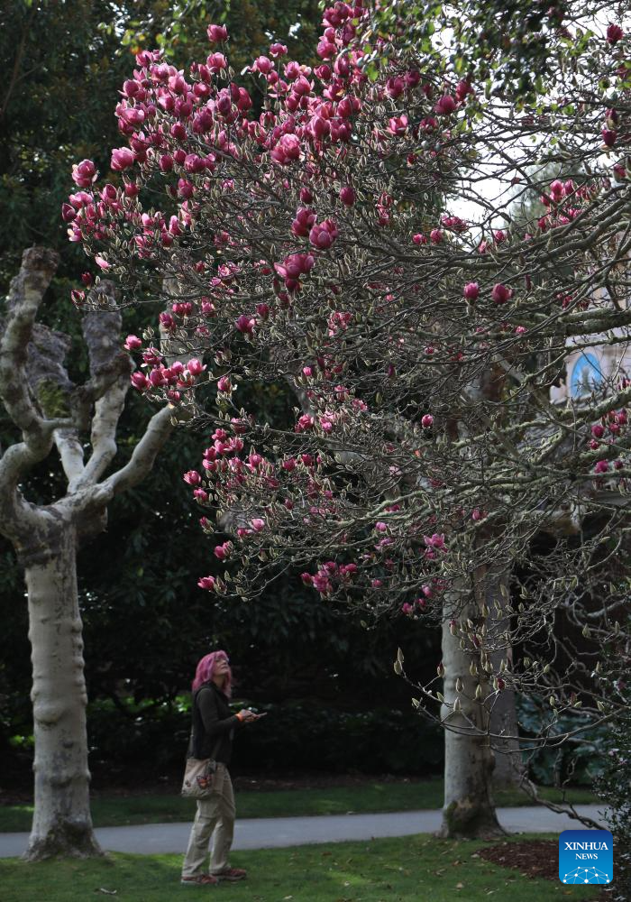 A woman enjoys blooming flowers at the Filoli Historic House & Garden of Woodside in San Francisco Bay Area of California, the United States, on Feb. 9, 2026. (Photo by Liu Yilin/Xinhua)