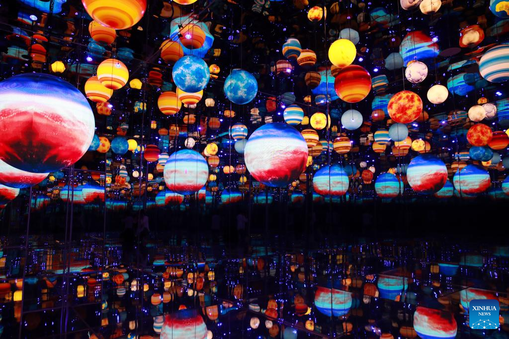 People enjoy a space-themed immersive digital experience exhibition at DigiPark Sydney in Sydney, Australia, Feb. 10, 2026. The DigiPark Sydney launched an immersive digital experience exhibition on traditional Chinese cultures, which is supported by holographic digital display technology. (Xinhua/Ma Ping)