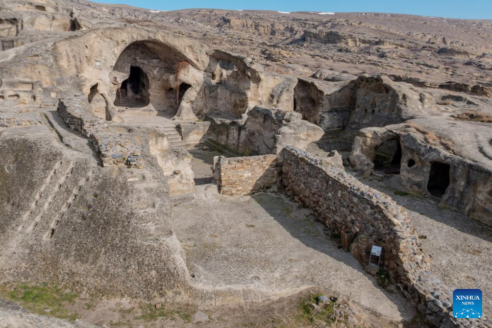 This photo taken on Jan. 30, 2026 shows the ruins of the Uplistsikhe rock-hewn city near Gori, Georgia. The Uplistsikhe rock-hewn city ruins is located on a high rocky hill on the bank of the Kura River near Gori in Georgia. It has been on the UNESCO World Heritage Tentative List since 2007. (Xinhua/Chen Junfeng)