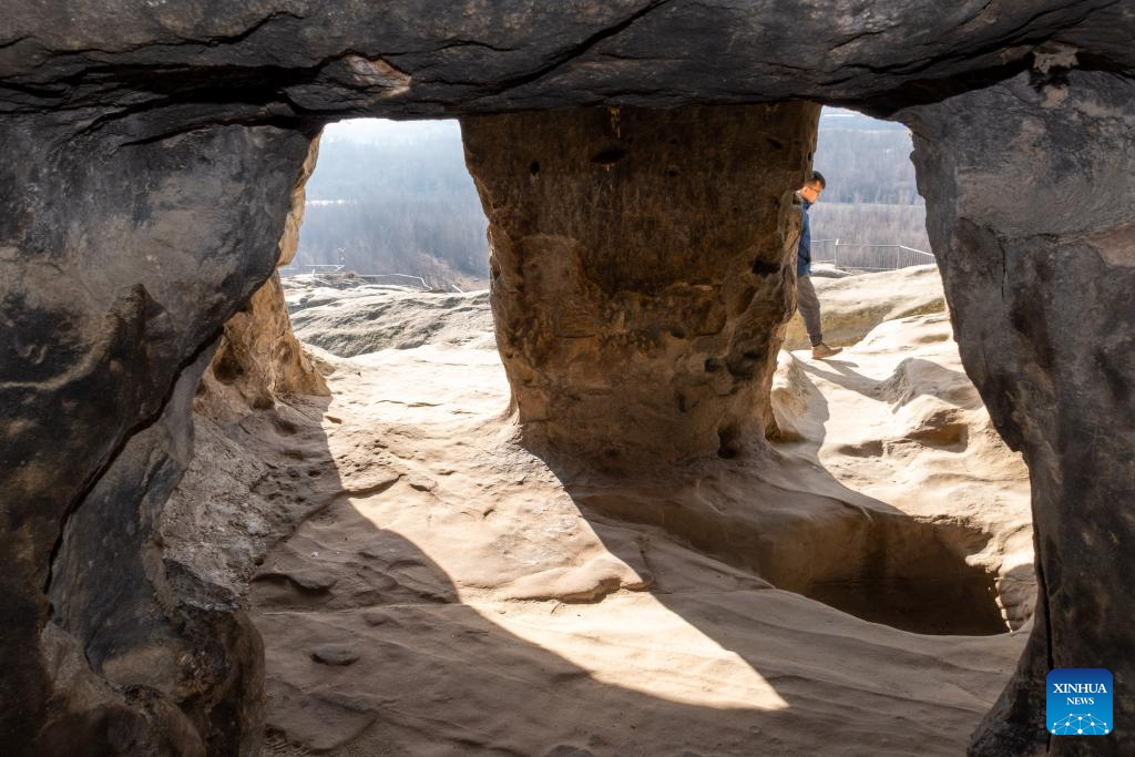 This photo taken on Jan. 30, 2026 shows a decorated cave ceiling at the ruins of the Uplistsikhe rock-hewn city near Gori, Georgia. The Uplistsikhe rock-hewn city ruins is located on a high rocky hill on the bank of the Kura River near Gori in Georgia. It has been on the UNESCO World Heritage Tentative List since 2007. (Xinhua/Chen Junfeng)