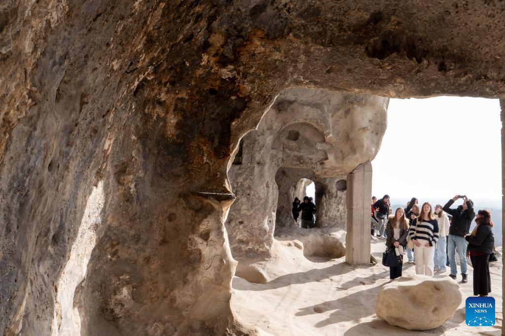 People visit the ruins of the Uplistsikhe rock-hewn city near Gori, Georgia, on Jan. 30, 2026. The Uplistsikhe rock-hewn city ruins is located on a high rocky hill on the bank of the Kura River near Gori in Georgia. It has been on the UNESCO World Heritage Tentative List since 2007. (Xinhua/Chen Junfeng)