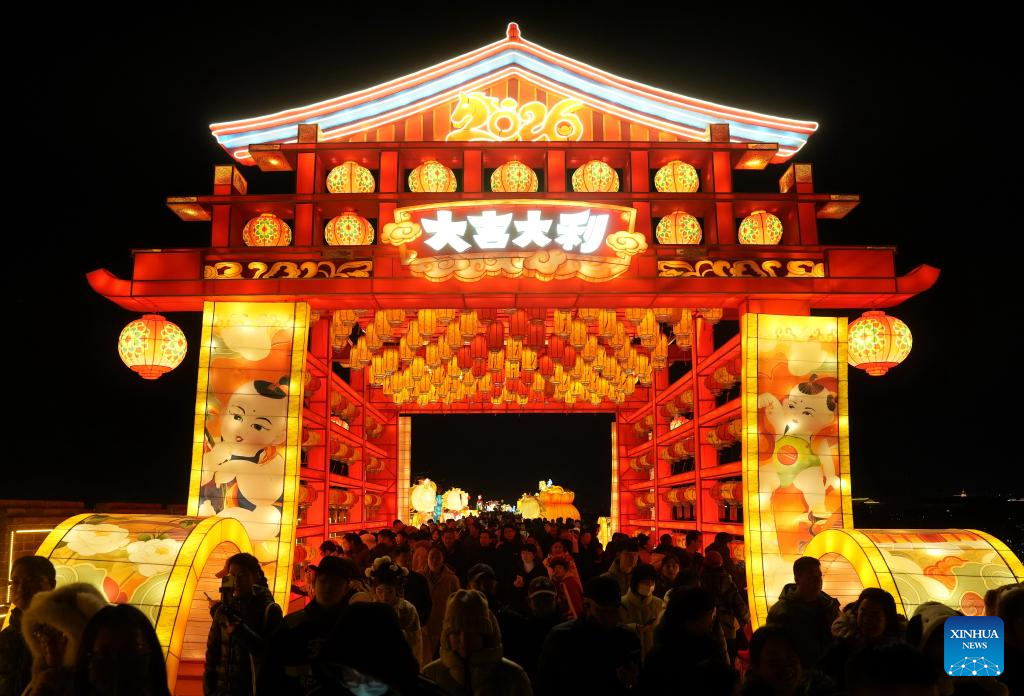 People watch a giant lantern for the upcoming Spring Festival in Lanzhou, northwest China's Gansu Province, Feb. 10, 2026. With the Spring Festival approaching, festive events are held across China to usher in the holiday. (Xinhua/Lang Bingbing)