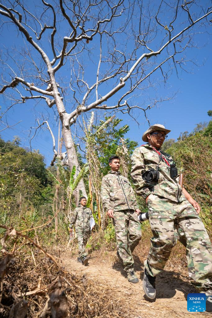 Members of the "Hornbill Patrol Team" record the status of hornbills while patrolling in Shiti Village, Yingjiang County, southwest China's Yunnan Province, Feb. 6, 2026. In Yunnan Tongbiguan provincial nature reserve, hornbills, a species under first-class state protection in China, are in a critical period of breeding preparation. Members of the "Hornbill Patrol Team" conduct regular patrols to ensure their safety during the breeding season.